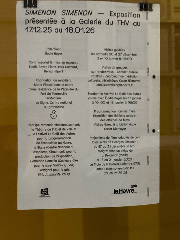Du 17 décembre 2025 au 18 janvier 2026, la Galerie du Théâtre de l’Hôtel de Ville du Havre accueille une exposition originale autour de l’œuvre de Georges Simenon dans le cadre du festival littéraire Le Goût des Autres. L’entrée est libre et gratuite, ouverte à tous les amoureux de livres, de graphisme et de culture populaire.